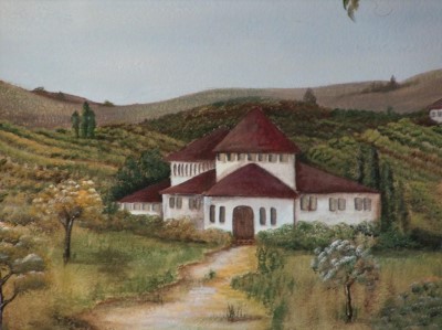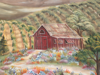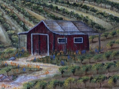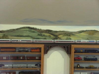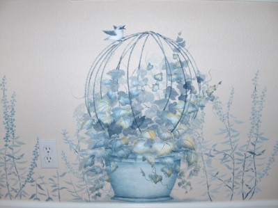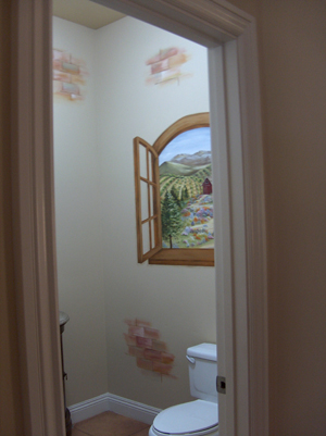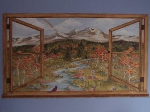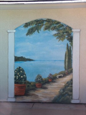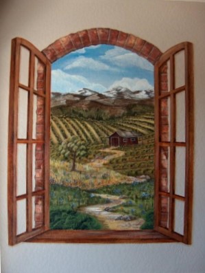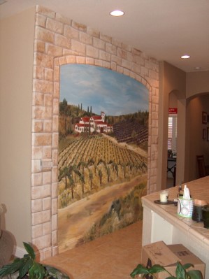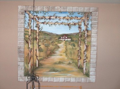 This view to an outside arbor and vineyard scene, with surrounding stone, created a focal point and filled in a blank wall. I was happy with the end result but even happier to get back on solid ground!