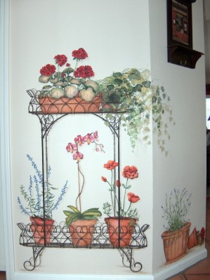 This plant stand motif was acutally commissioned by the man of the house. He does most of the cooking and wanted something perennially beautiful to look at while he was in the kitchen. These blooms will never fade - promise!!