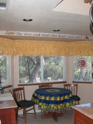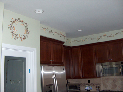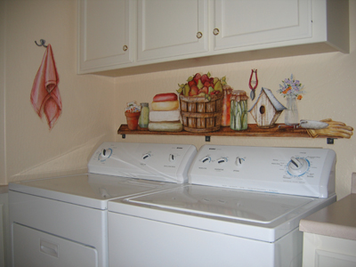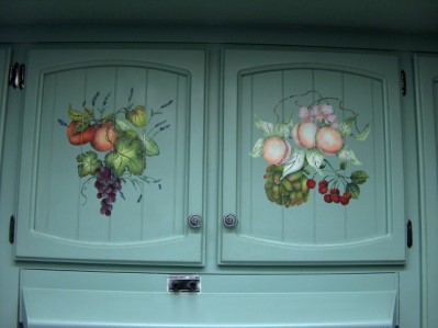 This client was updating an 80's kitchen with little available wall space. She repainted her cabinets and we created beautiful unique fruit/vegtable motifs to bring color and character to her "new" kitchen.