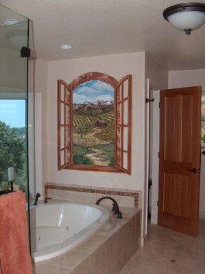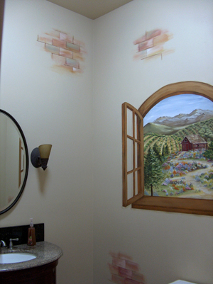 We designed the mural together, incorporating elements in the room, such as the wood work, custom tile work, and the view they wanted to see out their "window." In addition to their real, westward facing view, they now have a new view out a faux window.