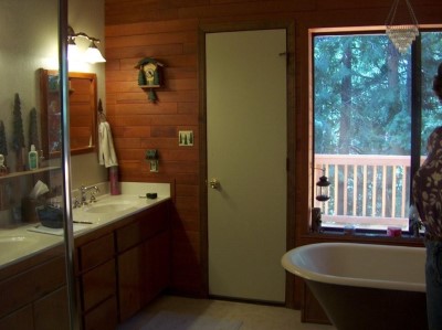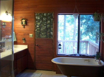 This is what the bathroom looks like now. See the difference? The door was painted to match the cedar planking in the room and the open "window" on top matches the homeowner's wonderful view from the tub.
