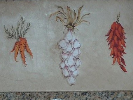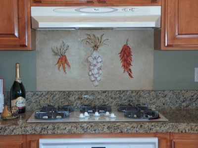 This backsplash is painted in the trompe l'oeil style. Using realistic colors and shading gives these veggies true dimension. Often, this space goes unused. It is a great blank canvas for a small motif that makes a great visual impact.