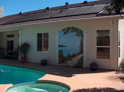 This mural is painted with outdoor paint on a very rough, stucco surface. The image reflects the beautiful pool and colors in the homeowners backyard.