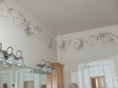 These are some of my best examples of stenciling in a “trompe l’oeil” style. Pronounced “trump loy,” this literally means to paint such that you “trick the eye” into believing the items are real.